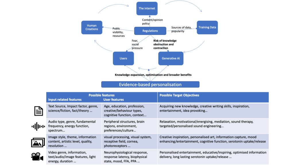 On the bottom of Figure 1, for each type of creation (artificial or human) we list some examples of input and user related features, that one could try to capture as context or tweakable parameters to serve content in line with personal target objectives set by the user. There is a strong overlap across the features and target objectives especially as video can cover other inputs and related effects on the user or their target objectives. Example implementations once sufficient training examples are available could be: (1) a pretrained optimiser that feeds into the generative AI the optimal settings for the tweakable content features for the given user context and target objective and (2) retraining of large transformer models to include mappings between content, user context and target objectives.
