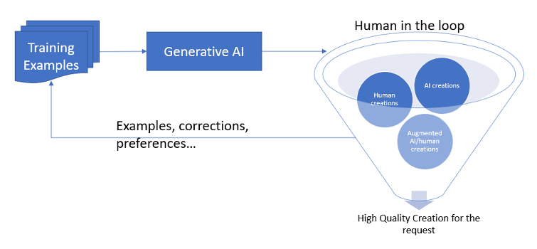 3. The human in the loop will augment the AI-generated content with their own creations where AI lacks -> new high-quality examples to train their AI models -> improves the quality and novelty of their AI-generated content.