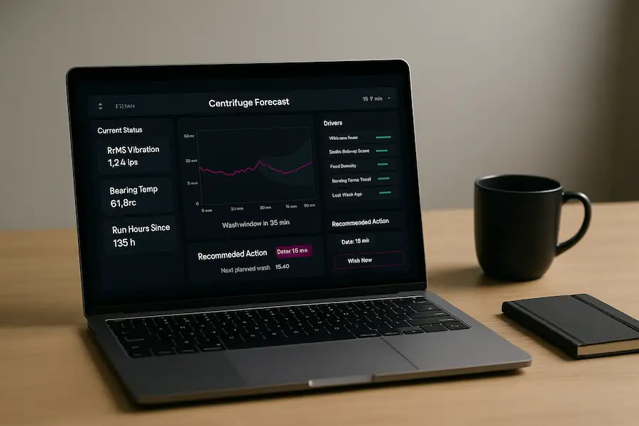 • Predictive model: Trained on historical data from several centrifuges to forecast near-term vibration levels.